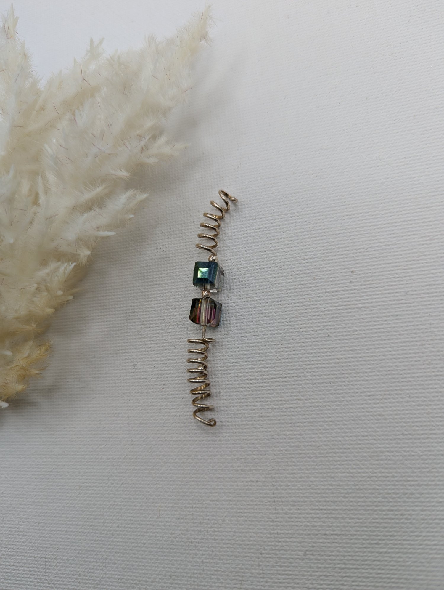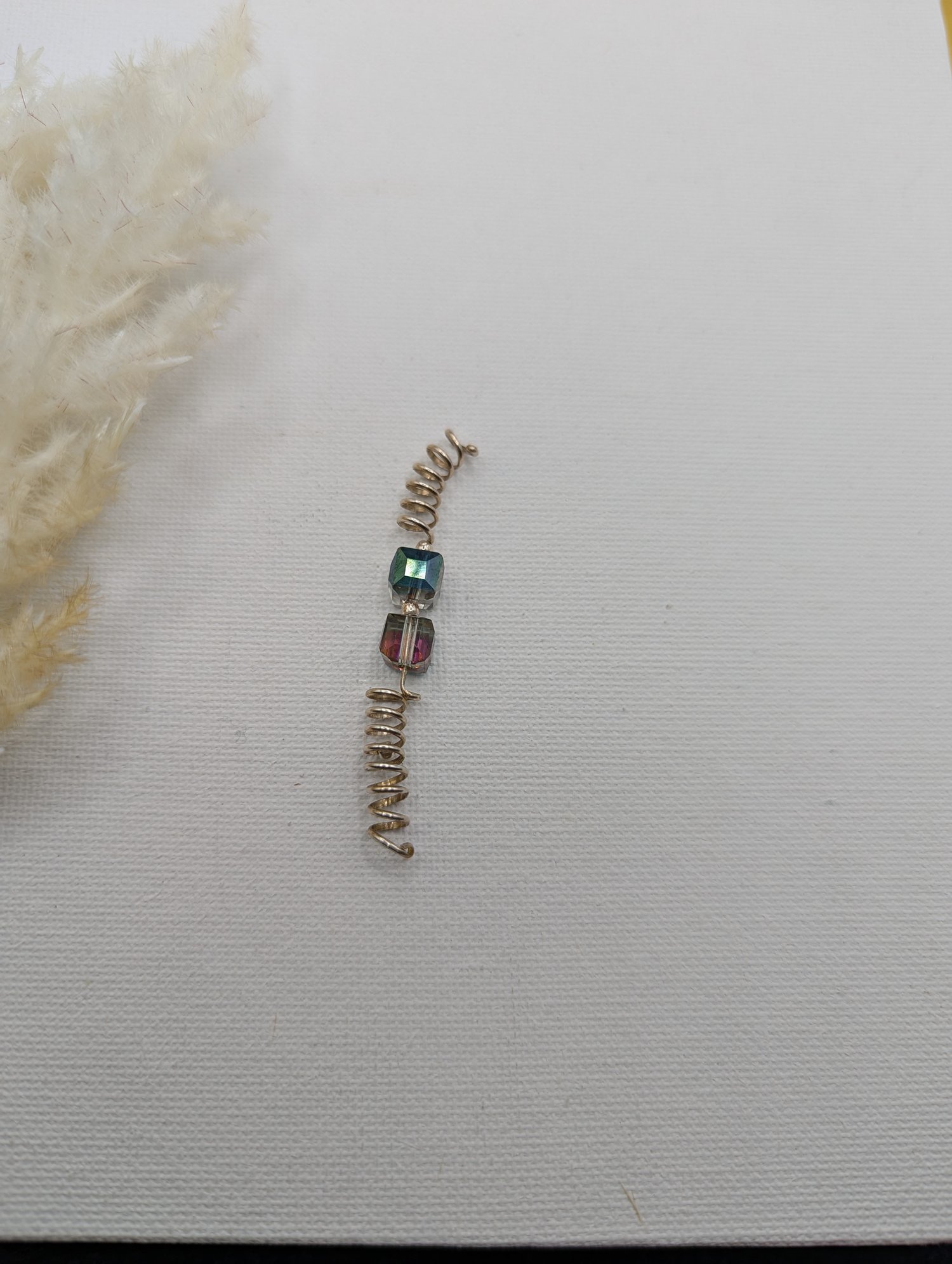 Add sparkle to your hairstyle with this handmade sterling silver loc jewel featuring genuine Austrian crystals. Wrapped in .925 sterling silver wire, it is a delicate statement designed to move effortlessly with your locs. This piece features two faceted Austrian crystals that shimmer with subtle, shifting tones—catching the light without overpowering your natural style. Its spiral design wraps securely around a single loc, creating a floating, weightless look that feels both earthy and refined. Perfect for everyday wear or special moments, this loc jewel adds just the right touch of elegance, intention, and sparkle.
